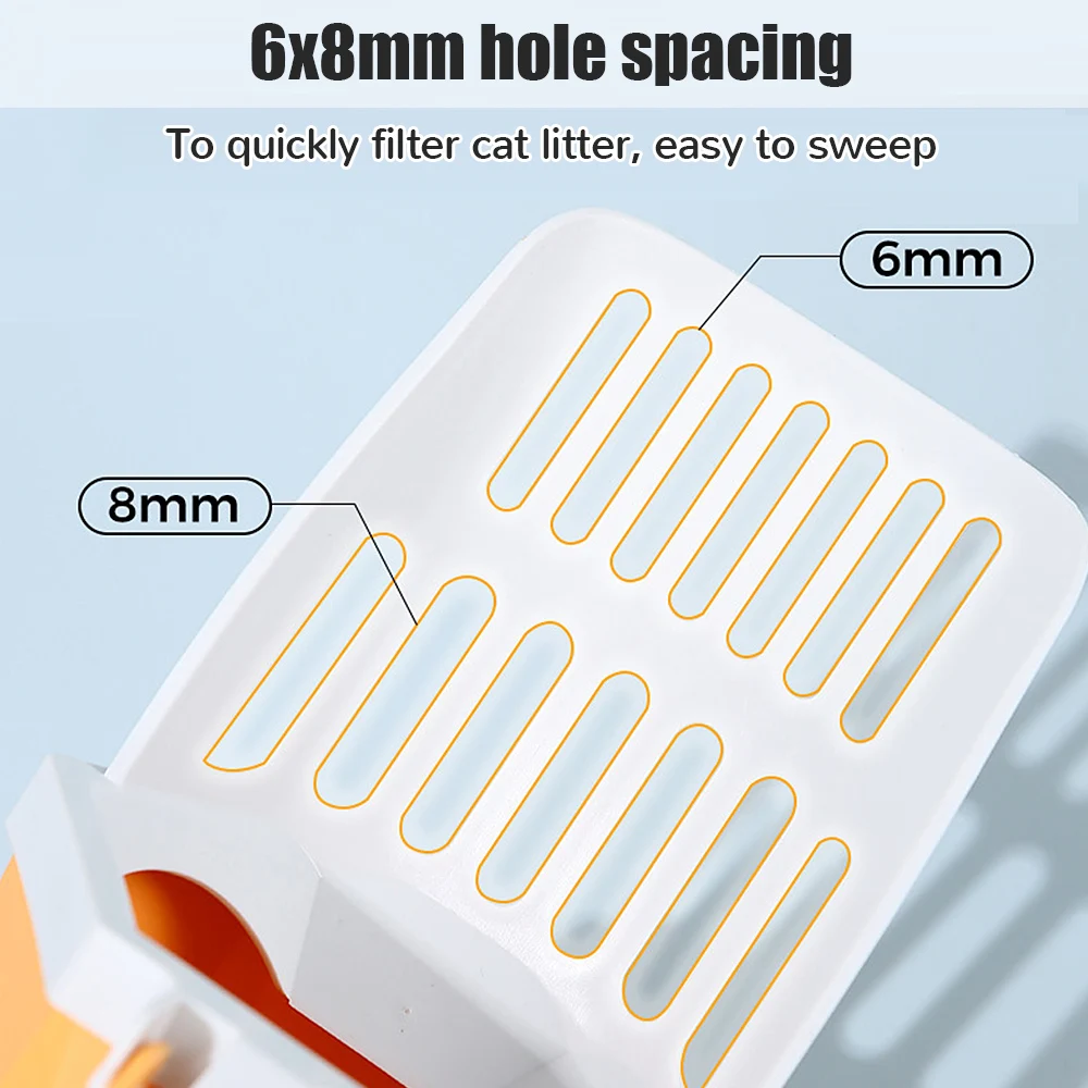AMAZING QUALITY: Sturdy enough to scoop up even for big chunks. Perfect size holes (6MM/8MM), so the clean cat litter can go through. Perfect work with pellet style litter as well.