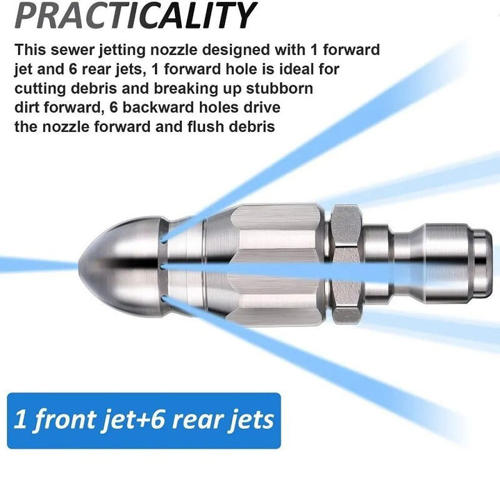 ⚡Unique Design - The nozzle is designed with 1 front jet and 6 rear jets, the front jet spouts water forward, loose and cutting blockages, the rear jets spout backward, drive nozzle forward, and flush and clear obstacles.